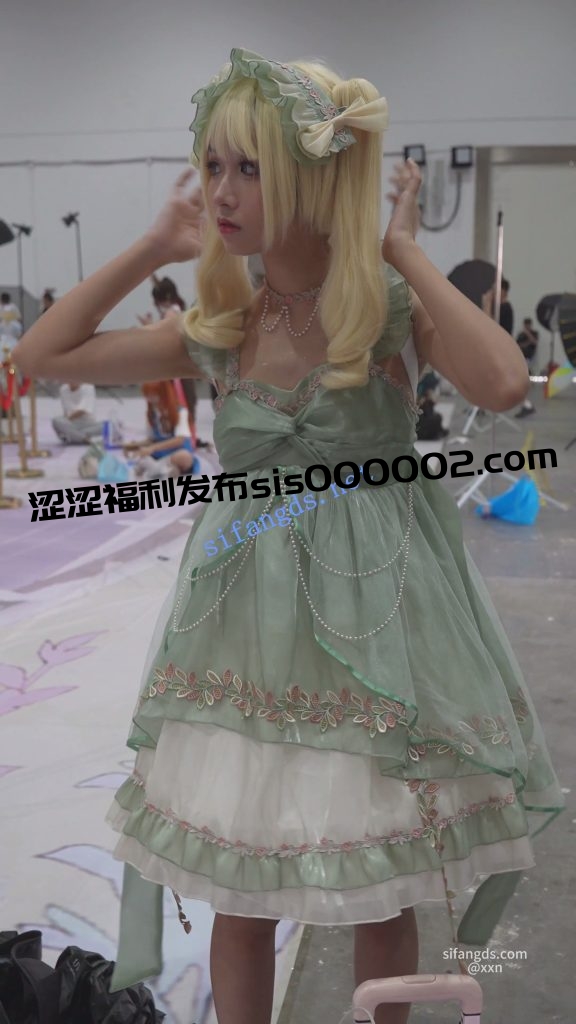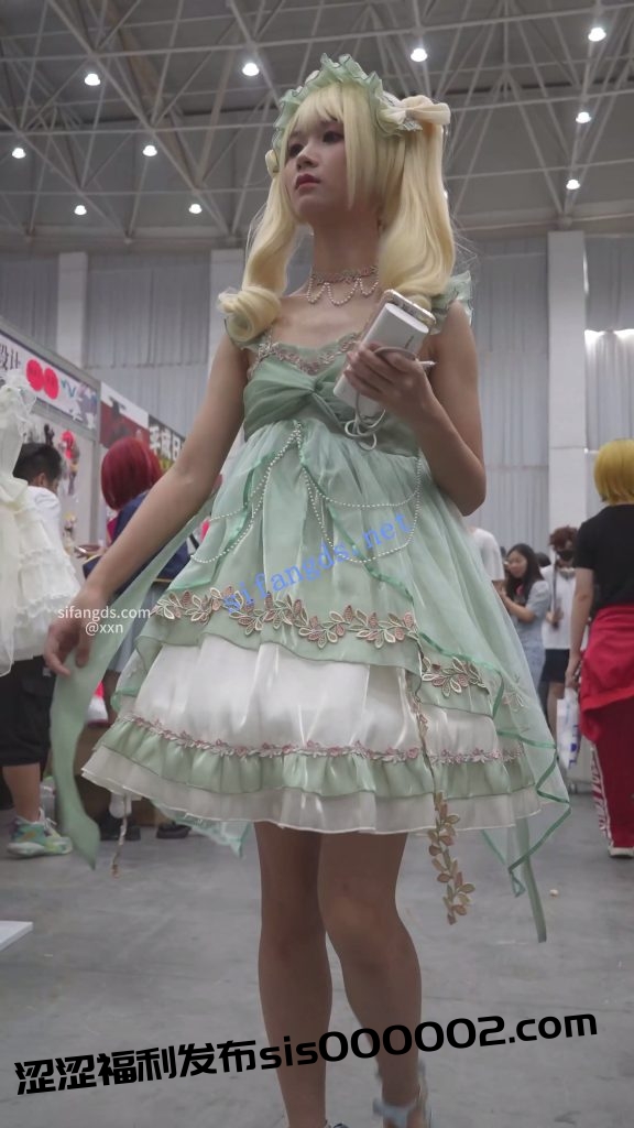 •  双马尾蕾丝裙美女,穿了裙撑裙子非常短,里面竟然无打底,浅黄内前后CD。